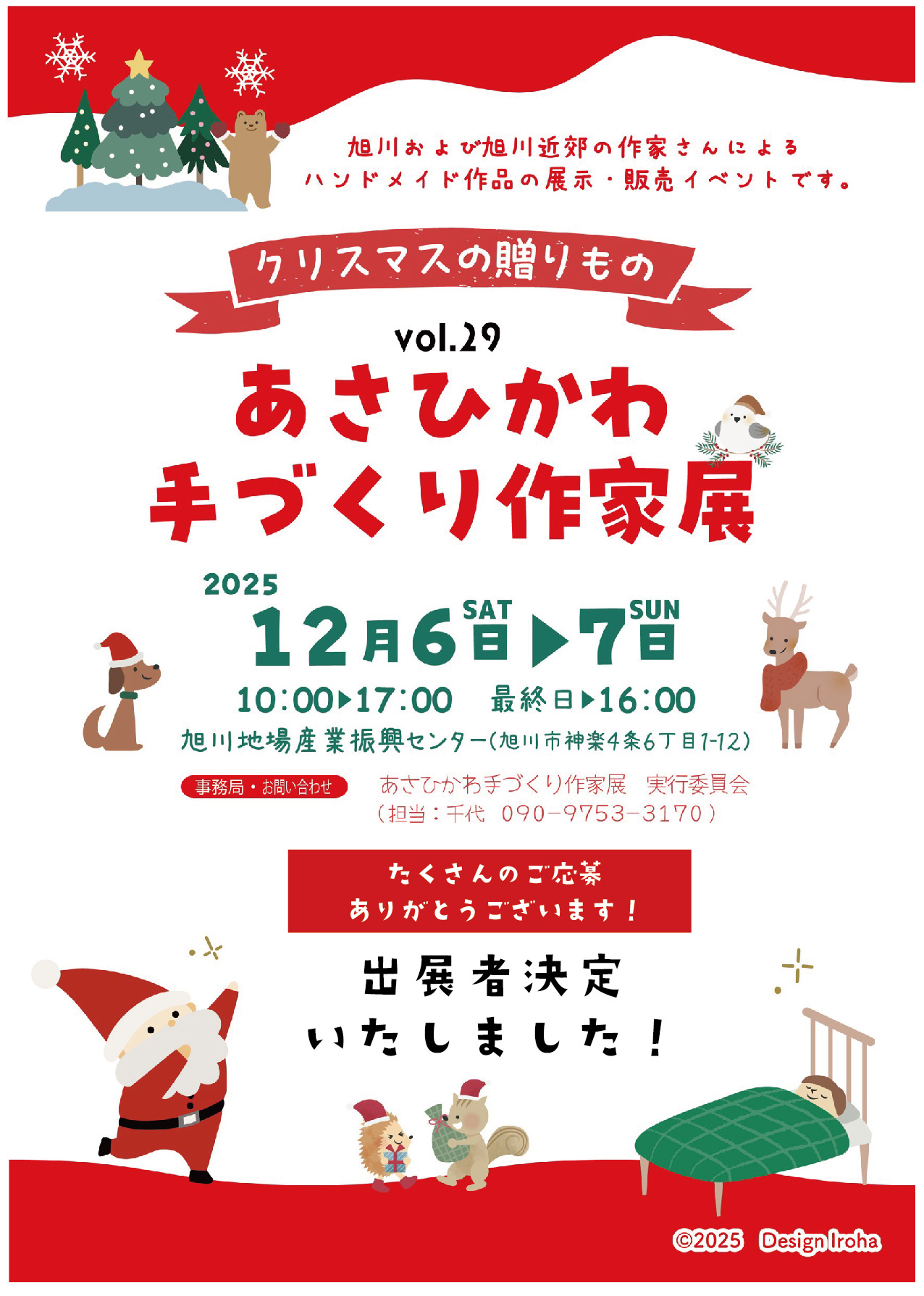 「第29回 あさひかわ手づくり作家展〜クリスマスの贈りもの〜」12月6日(土)、7日(日)旭川地場産業振興センターで開催決定!たくさんのご応募ありがとうございました!出展者作家様決定いたしました。詳しくはお知らせをご覧ください。