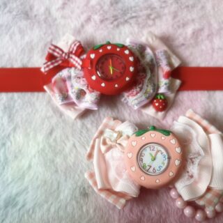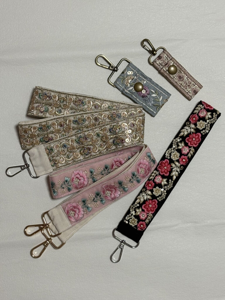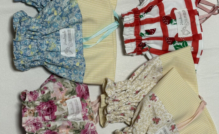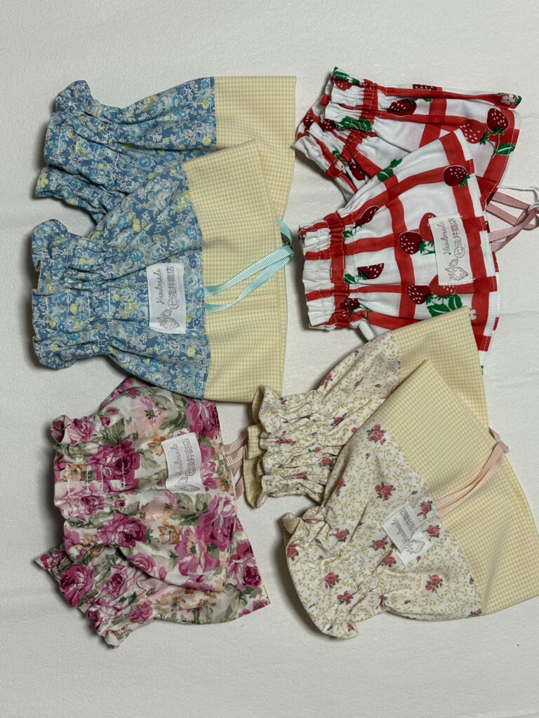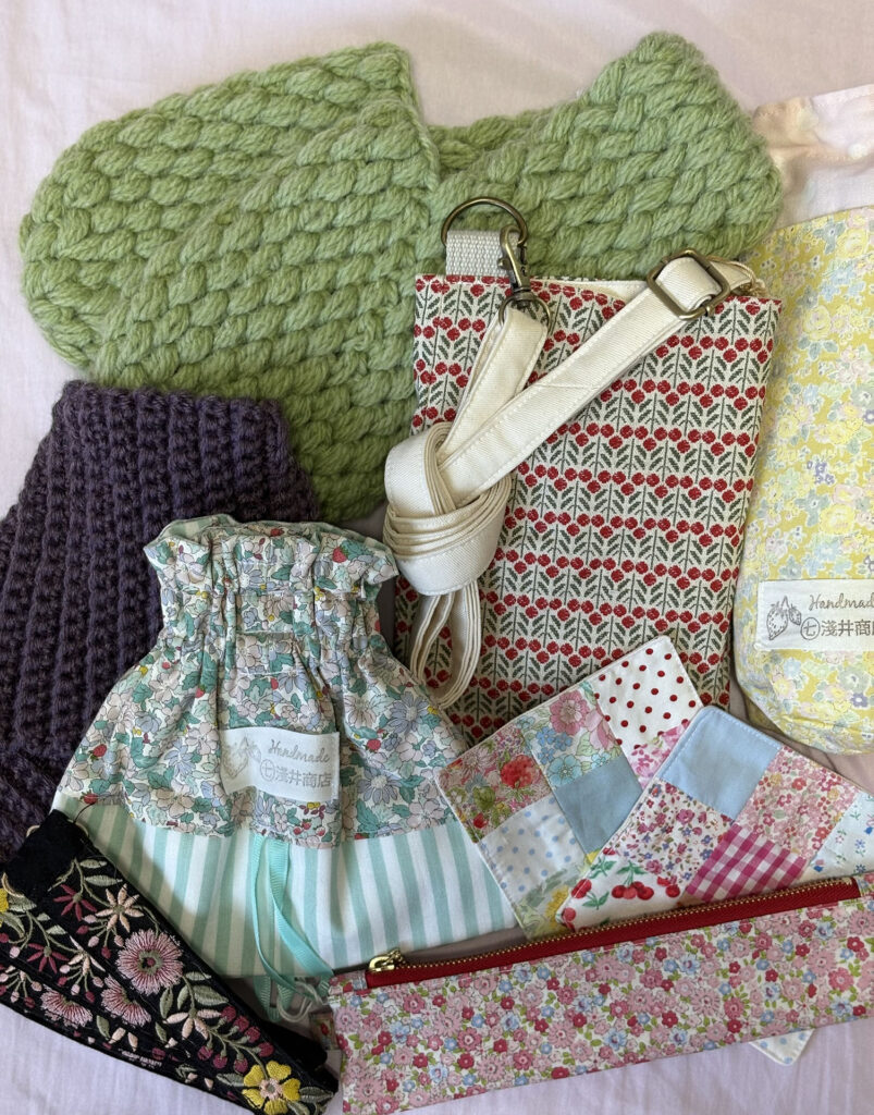 布製品はかばん、サコッシュ、アームカバー、インドレースストラップ等で、花柄やいちご柄をメインとした商品です。