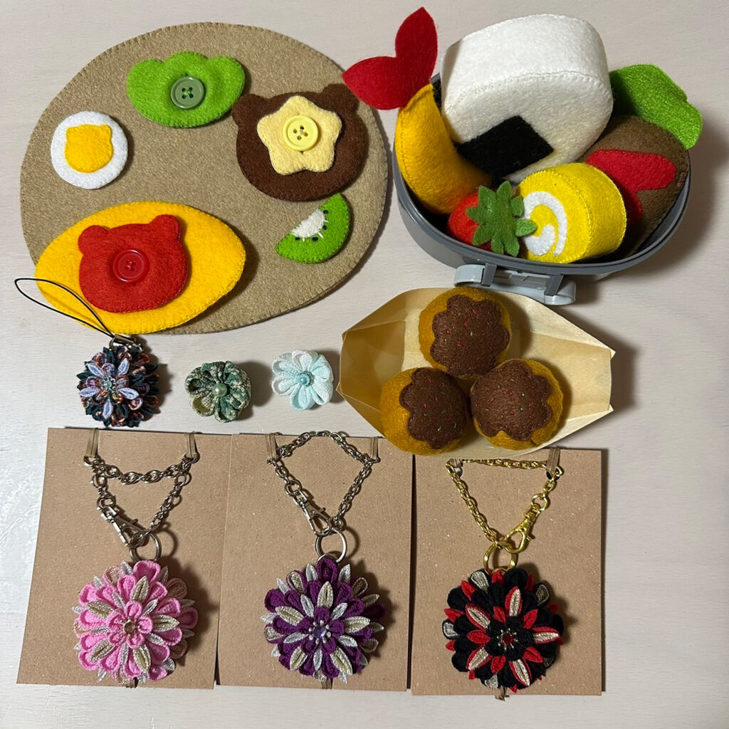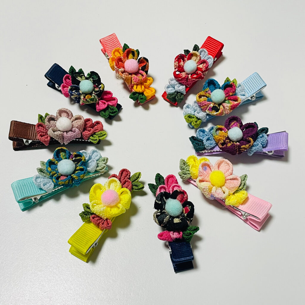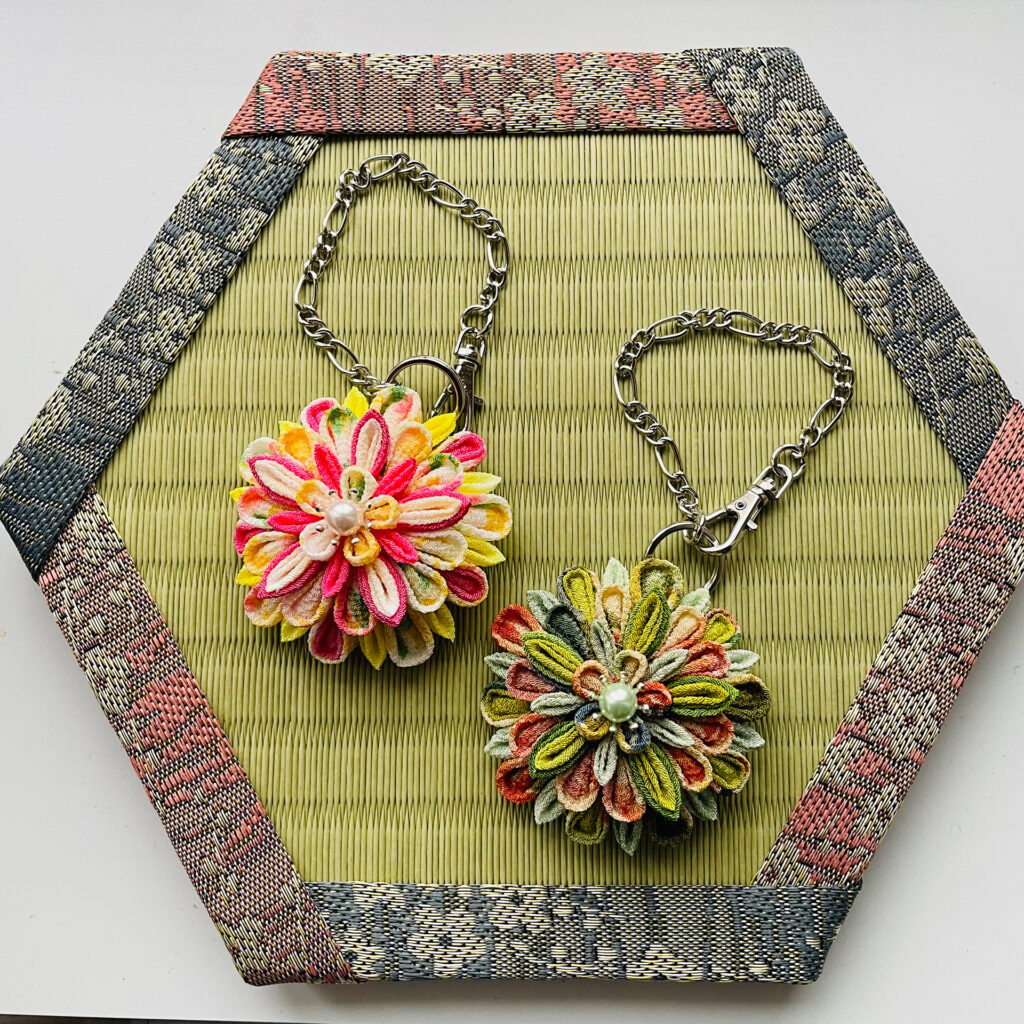 普段使いできるつまみ細工のヘアゴムやバッグチャーム、キーホルダーなどを作るちーこ。