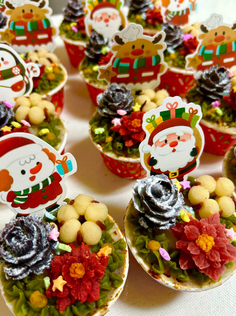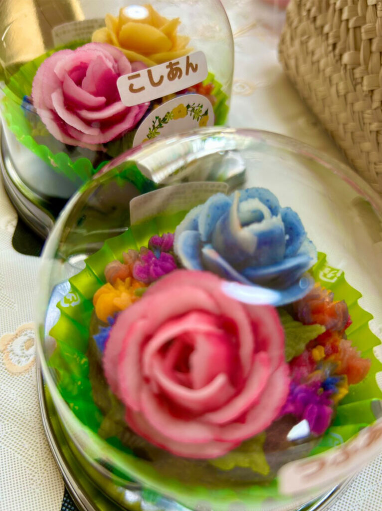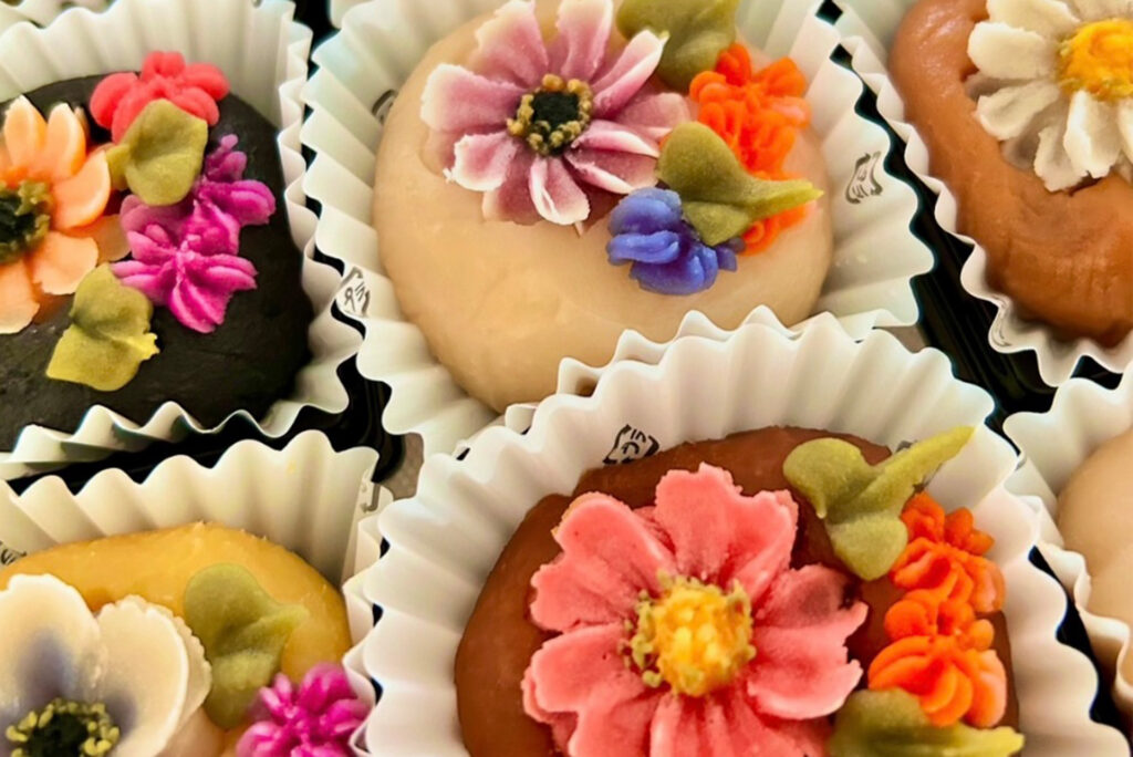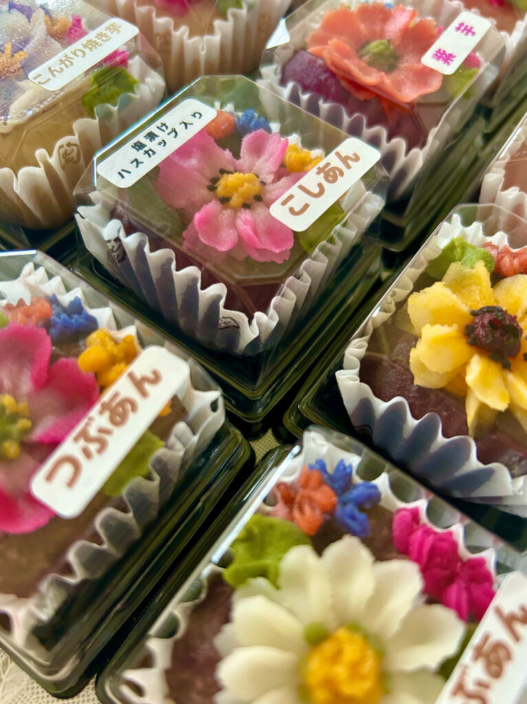旭川市末広東にお店があります。フラワースイーツポノです。 おはぎやカップケーキなどに 白餡を天然色で色付けしたものを絞り袋に入れ一つ一つ手絞りしたお花をのせて販売しています。